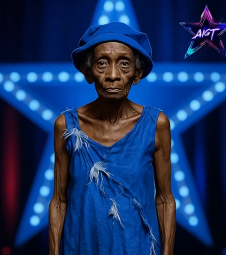 An elderly woman, slender and fragile, stepped slowly into the spotlight, her frail figure wrapped in a tattered blue dress. A faded blue hat rested softly on her head, its edges worn from years of sun and rain. Her hands hung loosely by her sides, skin lined with the delicate traces of time, but her posture was straight, unwavering.