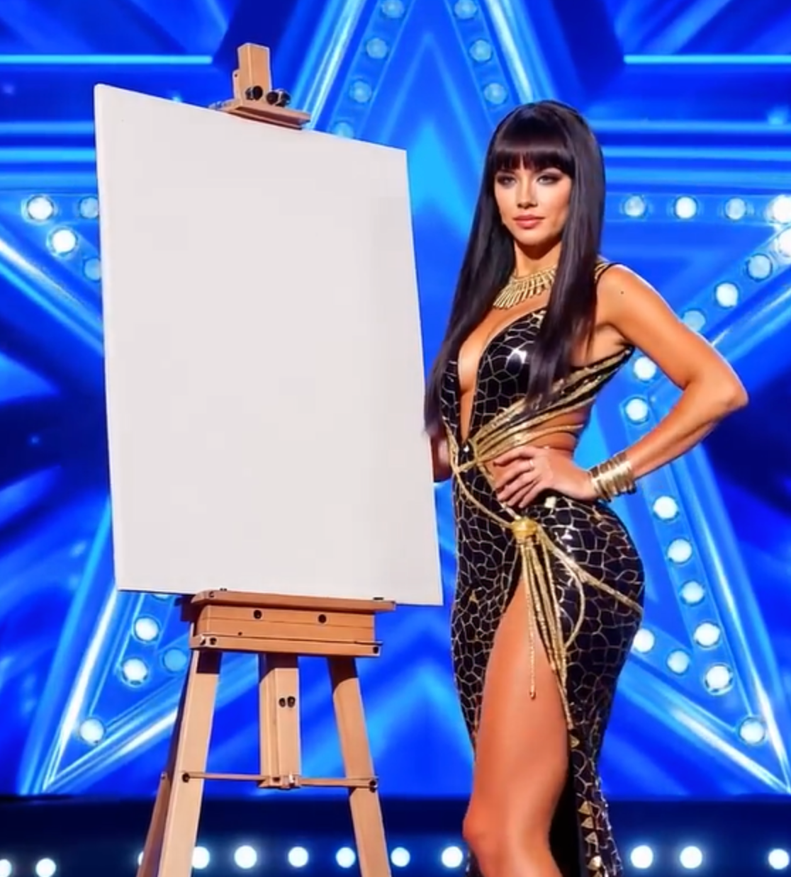 She stood beside a blank canvas under the brilliance of stage lights, dressed like a queen of contrast—sharp lines, gold glints, and purpose in her eyes. At first glance, she looked like a dancer, or maybe a magician. But beside her was only a canvas, an easel, and a silence waiting to be broken.