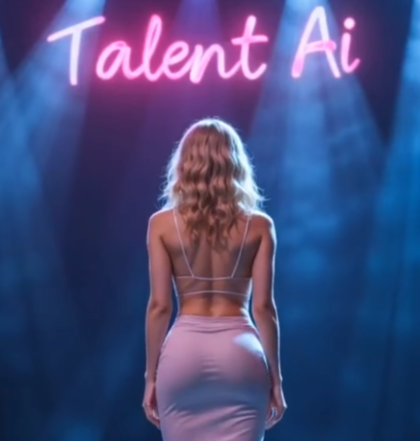 Soft blue beams crossed the air like threads of hope, and above her, glowing in pink neon, were two simple words: Talent Ai.