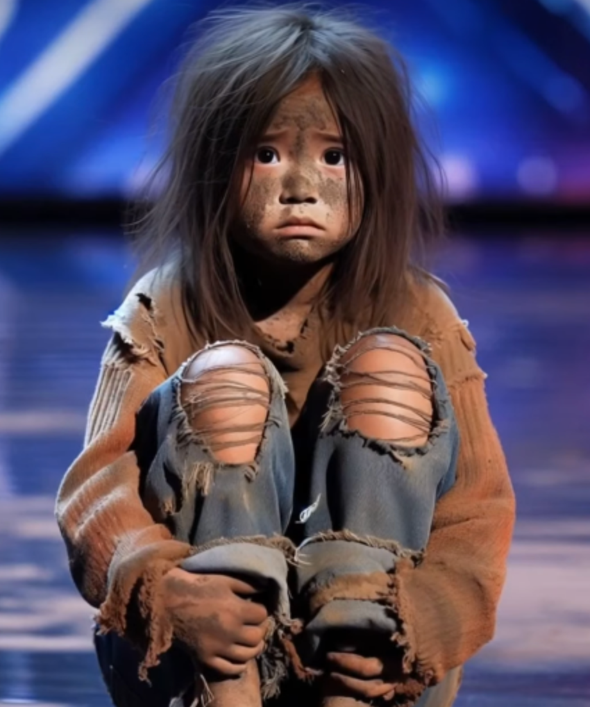 Under the blinding lights of the stage, a tiny figure emerged — barefoot, trembling, and dressed in torn clothes. Her small hands clutched her knees as she walked slowly to the center, every step echoing louder than the thunderous applause that would come later. She didn’t look like the others who came to perform on this grand stage; she looked like she had wandered straight out of a forgotten story.