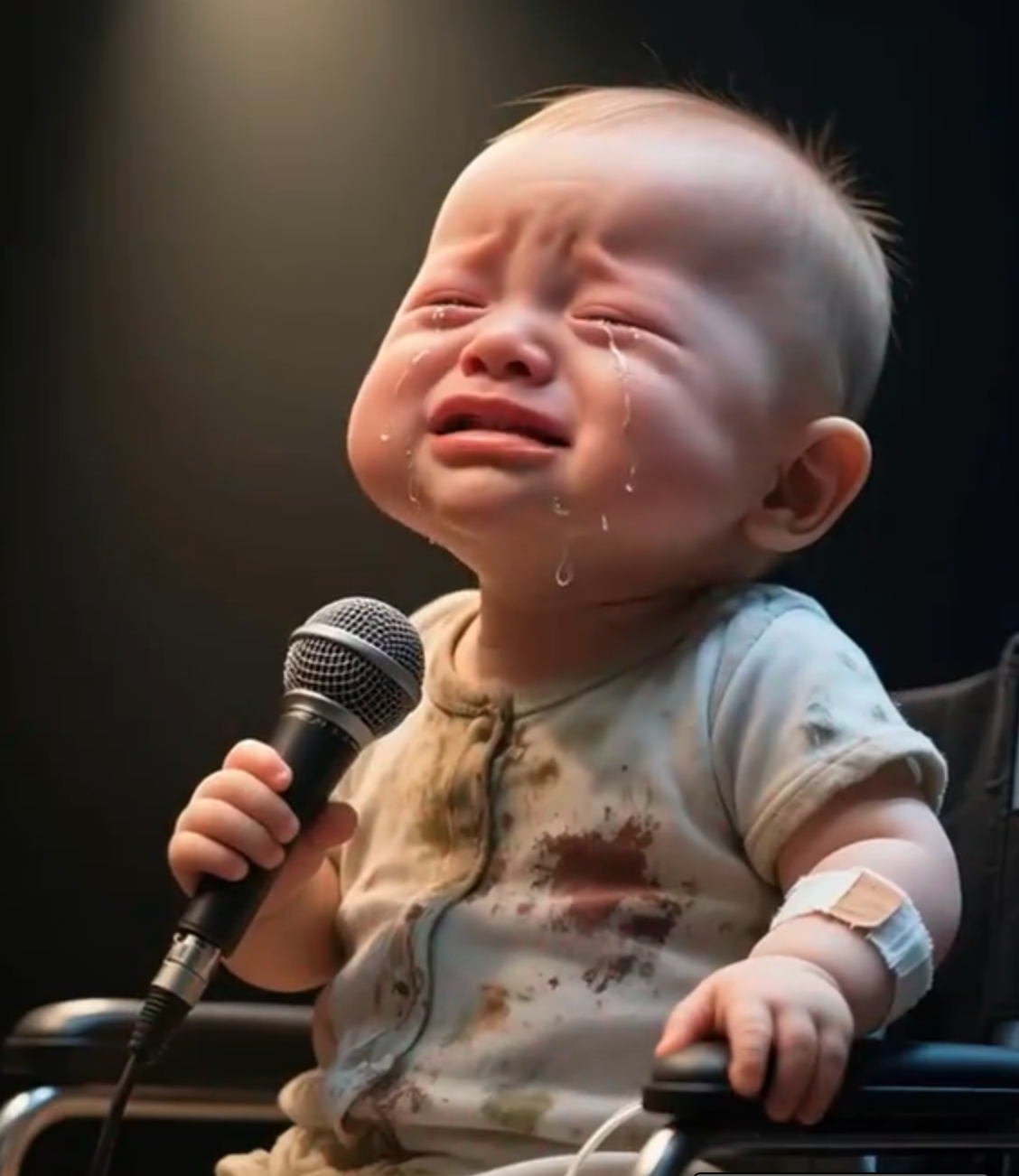 No one expected a performance from someone so small. A baby, barely old enough to walk, sat in a wheelchair. His onesie was worn and stained, his tiny arm wrapped in a hospital bandage. And in his hand — a microphone, too big for him to hold, yet held like it was the only thing tethering him to the moment.
