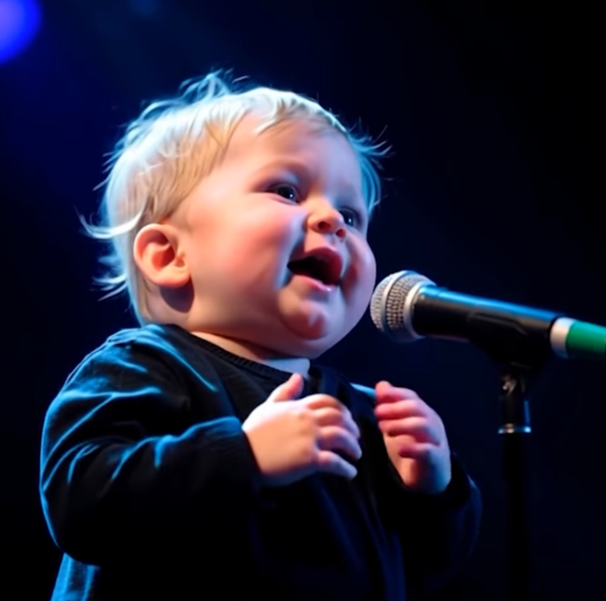 The scene opens with the familiar melody of Leonard Cohen’s “Hallelujah.” The soft instrumental begins to play, and the audience sees a little boy, no older than two, standing confidently before a microphone. His hands rest nervously near his chest, his bright eyes reflecting the stage lights. Then, something almost magical happens.