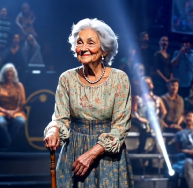 She didn’t walk onto the stage — she arrived. Gracefully. Gently. A cane in one hand, a lifetime in her eyes. The room shifted the moment she stepped into the spotlight. She wasn’t a contestant. She was a moment. A living memory wrapped in soft floral fabric and silver hair.