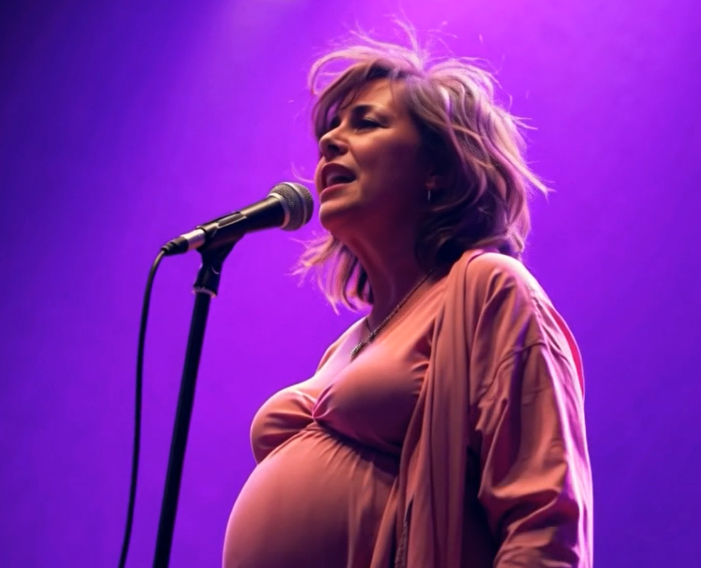 She stood still in the center of the stage. One hand cradling her belly. One holding the mic. A soft pink robe swayed gently against her body as the lights above cast a glow like moonlight.