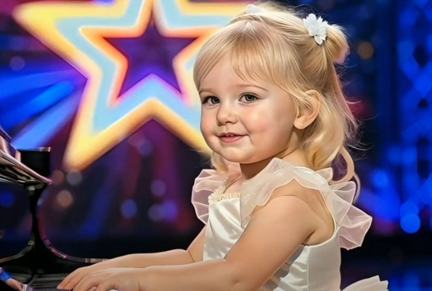 She looked like she’d stepped out of a fairytale—blonde curls bouncing around her cheeks, a delicate satin dress shimmering under the spotlight, and a glint of innocent curiosity in her big, round eyes. The piano keys seemed too large beneath her little fingers, yet there she sat, as if born for the moment.