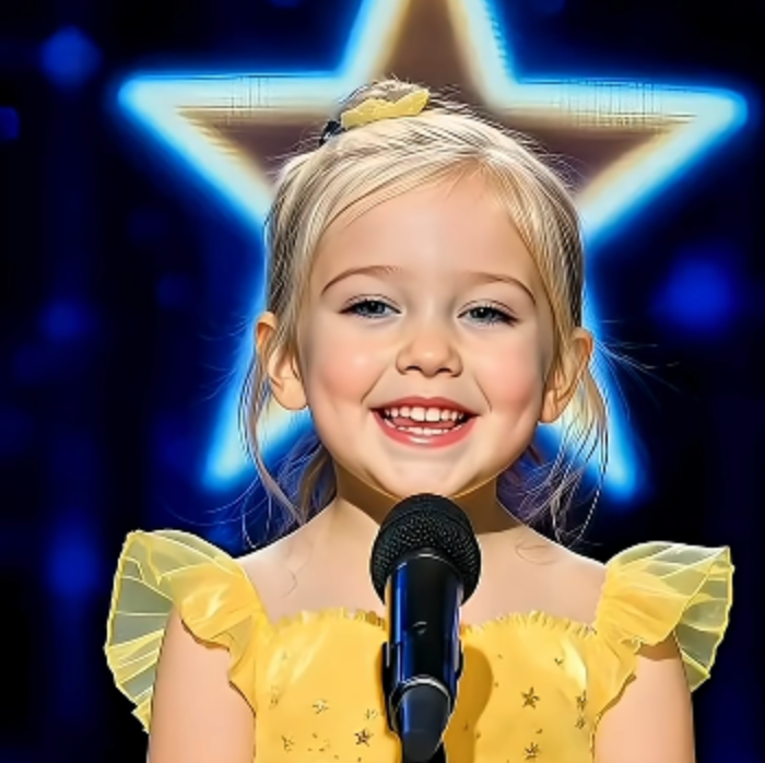 She stood there like a sunbeam made human — wrapped in a golden dress, her hands clasped sweetly in front of her, eyes wide and sparkling. Behind her, a glowing star lit the stage, but it wasn’t brighter than her smile. It wasn’t brighter than her.