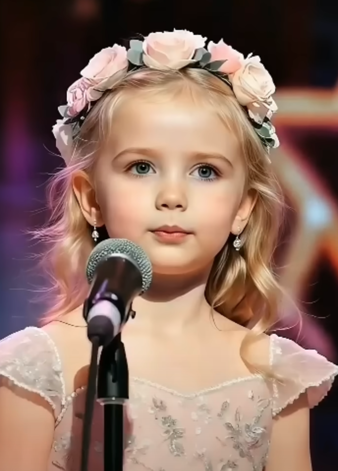 She stepped onto the stage like a page out of a fairytale — a little girl with wide, glistening eyes, a crown of blush-pink flowers resting gently atop her golden curls. The lights of the auditorium dimmed behind her, but her innocence shone brighter than any spotlight could cast. She didn’t flinch, didn’t fumble. Instead, she wrapped her small hands around the microphone and looked into the crowd with a calm that defied her age.