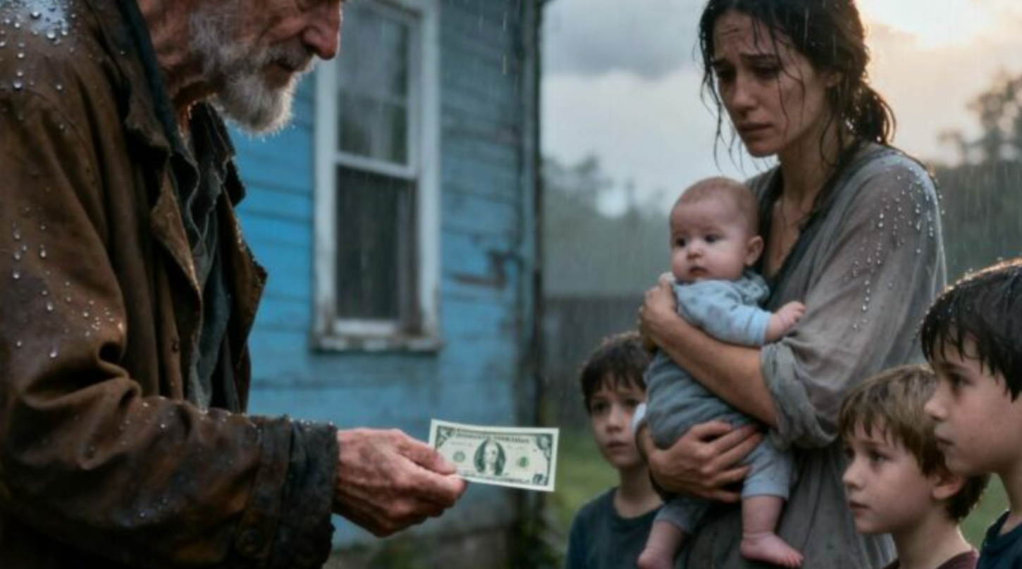 On a stormy autumn evening, on a quiet little street called Maple Lane, a single mother, Hannah Collins, was in the kitchen patching the school uniform of one of her children. Outside, thunder shook the neighborhood, and the streetlights were barely visible through the curtain of rain. Inside, the four children — Ava, Jacob, Lily, and Ben — worked on their homework by candlelight. The atmosphere was both calm and tense, until an old man, drenched to the bone, appeared at the door asking for a dry corner for the night.