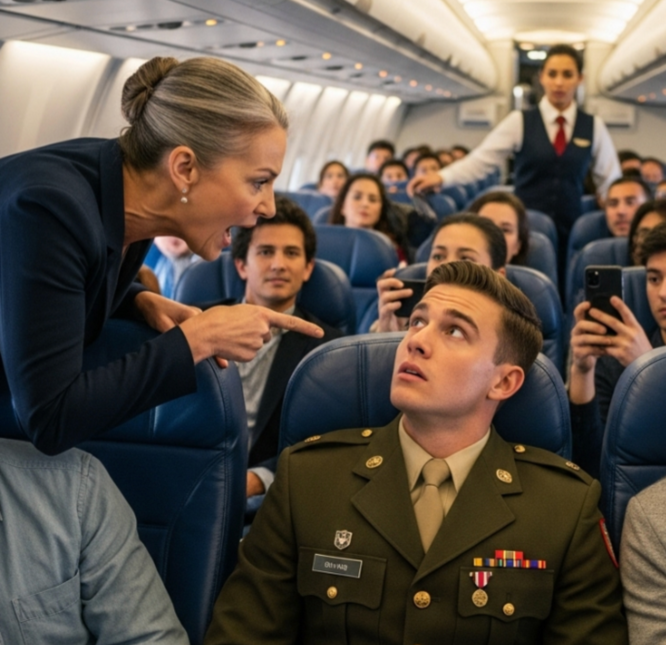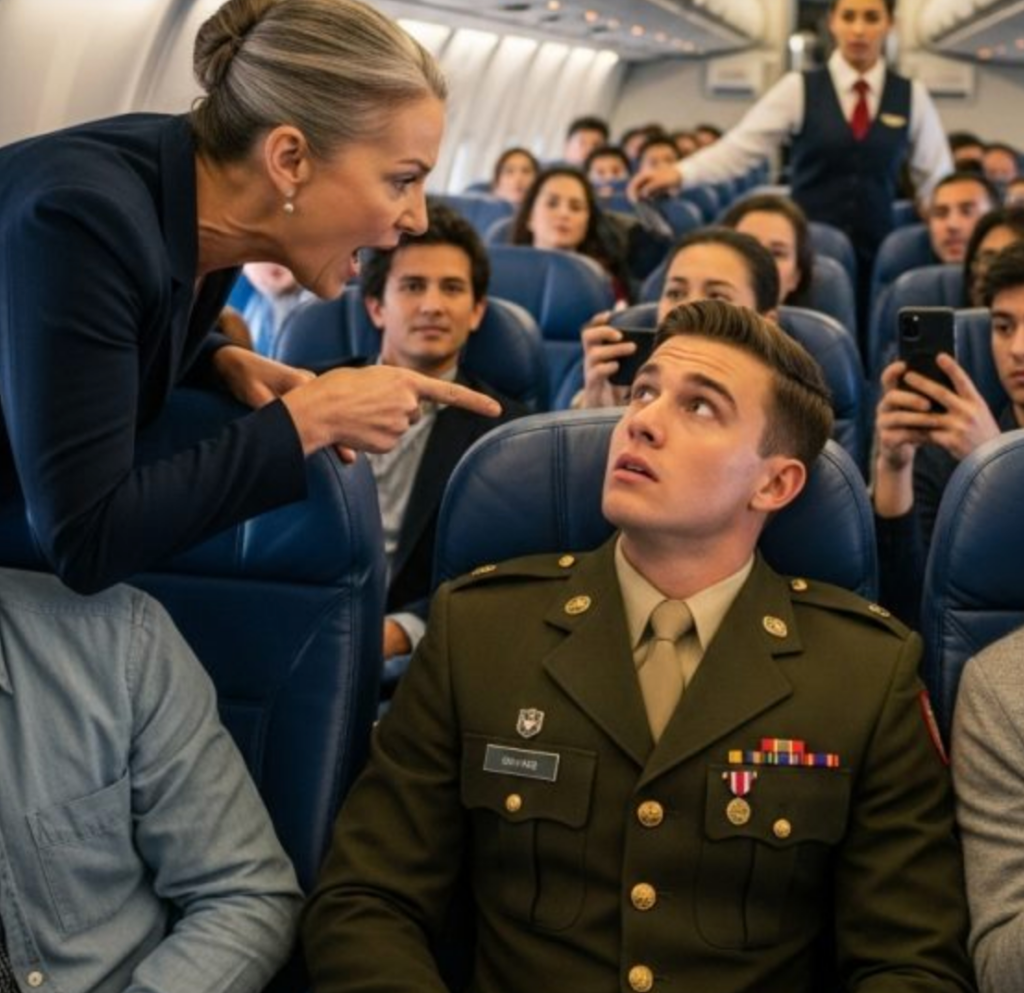 The young soldier’s silence only deepened the guilt written across his face. He turned slightly toward the window, staring into the clouds outside. The rest of the cabin remained silent—passengers uncomfortable, yet no one dared to intervene.