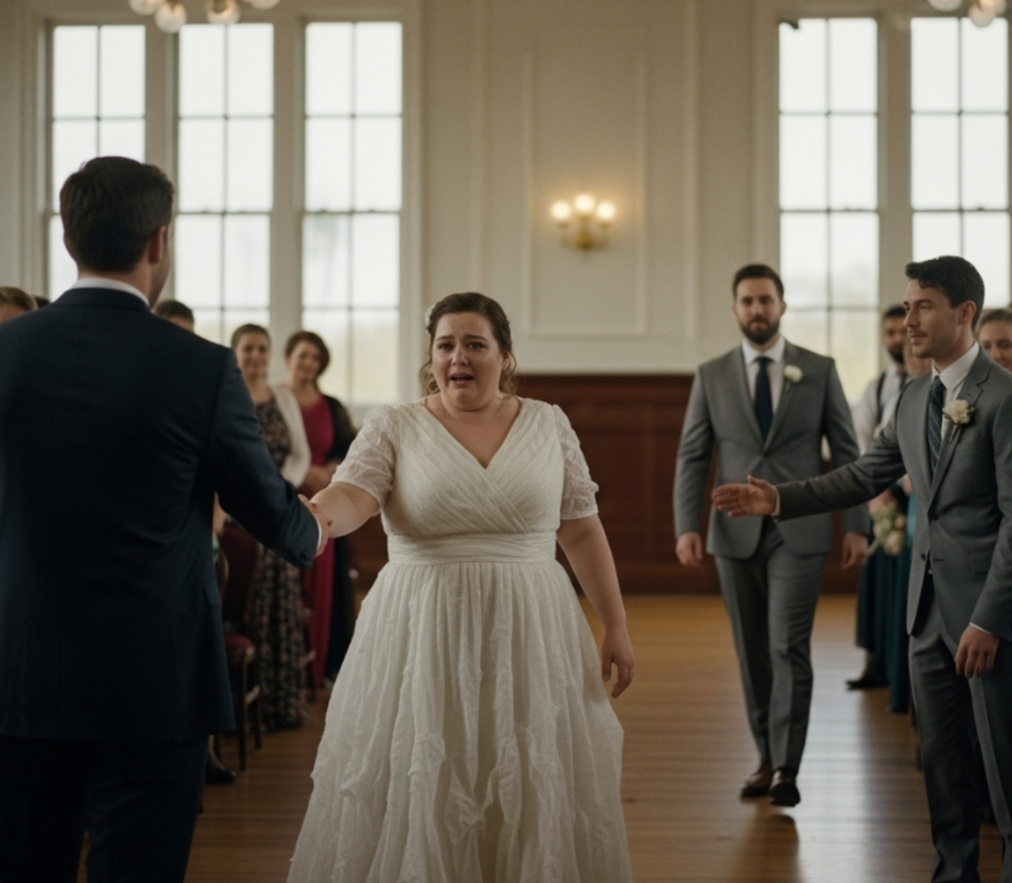 The bride stood motionless, her plus-size gown shimmering under the lights, her trembling fingers crushing the bouquet that was already falling apart.