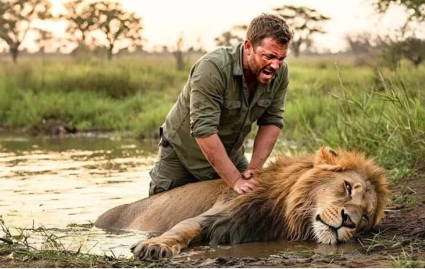 Finally, with incredible effort, he pulled the animal ashore. The lion lay motionless, his chest not rising. In despair the man knelt beside him and began performing chest compressions. His palms beat strongly, but the beast’s lifeless chest — again and again.