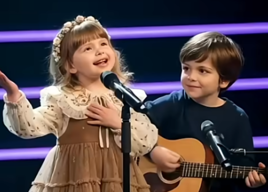 They looked like the sweetest pair—two small children standing under the bright stage lights, one holding a guitar much too big for him, and the other pressing a tiny hand to her heart as if singing was the only way she knew how to breathe. The audience smiled, expecting something cute, simple, innocent. But the moment the little girl lifted her voice and whispered, “I believe in angels,” the entire room felt something deeper—something that didn’t belong to children, yet lived inside them anyway.