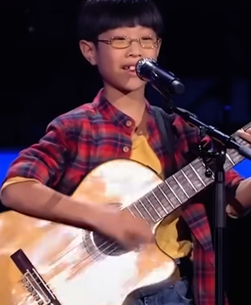He stepped into the spotlight wearing a simple plaid shirt and round glasses, gripping a guitar nearly half the size of his entire body. At first glance, he looked shy — almost fragile — a boy who might whisper instead of sing, a child who seemed more comfortable tucked away in a quiet corner than standing before thousands. But when he closed his eyes, took a breath, and strummed the first note, something powerful rose from inside him — something no one in the room expected.