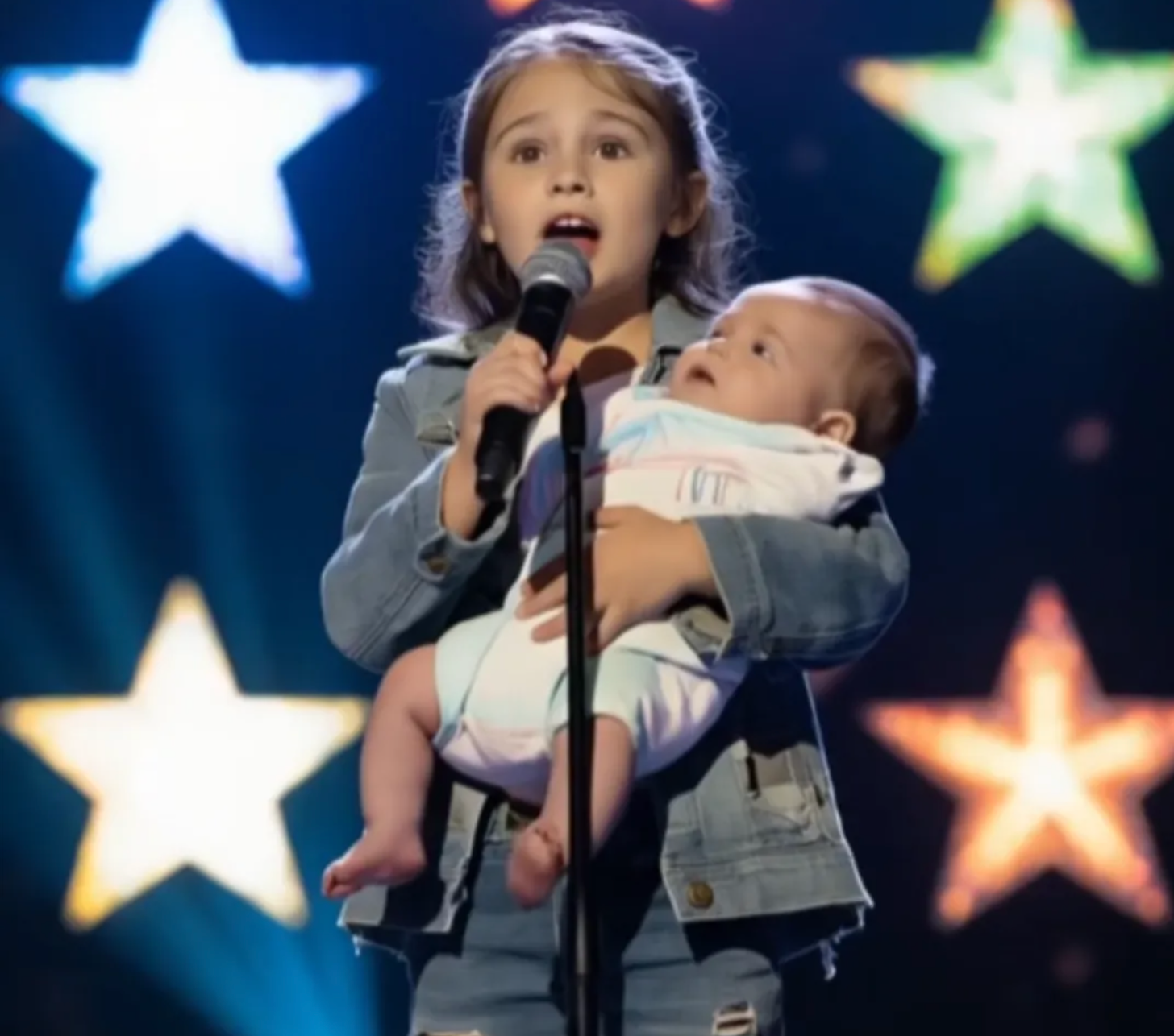 When a 10-year-old girl stepped barefoot onto the stage of America’s Got Talent, clutching a fragile bundle wrapped in a thin cloth, the audience had no idea the heartbreak hidden beneath her small, brave frame. In her arms was her infant brother, just a few months old, his tiny eyes shut as if shielding himself from a world too cruel too soon. The theater was silent, breaths held in the air, as she softly adjusted the cloth around the baby and stepped up to the microphone.