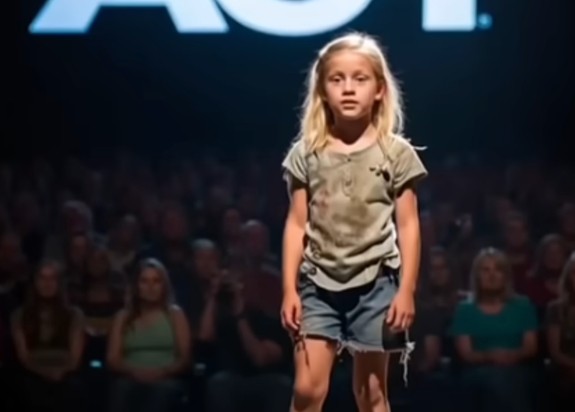 The stage lights blazed as a tiny figure walked out, her bare feet padding softly against the floor. She couldn’t have been more than seven years old. Her hair was slightly messy, her clothes worn and patched, the kind that told a story of struggle without a single word spoken.