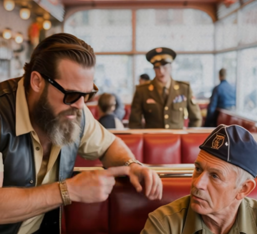 A group of bikers walked in, their leather jackets loud, their laughter louder. Most patrons glanced up briefly before returning to their meals—but one biker stopped, staring at the elderly man at the counter. He walked over, towering above the veteran, his sunglasses hiding his expression.