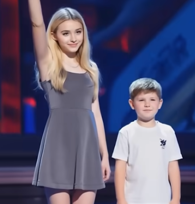 The stage lights glowed softly as a young girl and her little brother walked out hand in hand. She looked calm and graceful in her gray dress, her long blonde hair shining under the spotlight. The little boy beside her, wearing a white shirt and sneakers, held her hand tightly. He looked up at the crowd with big eyes that reflected both excitement and trust.